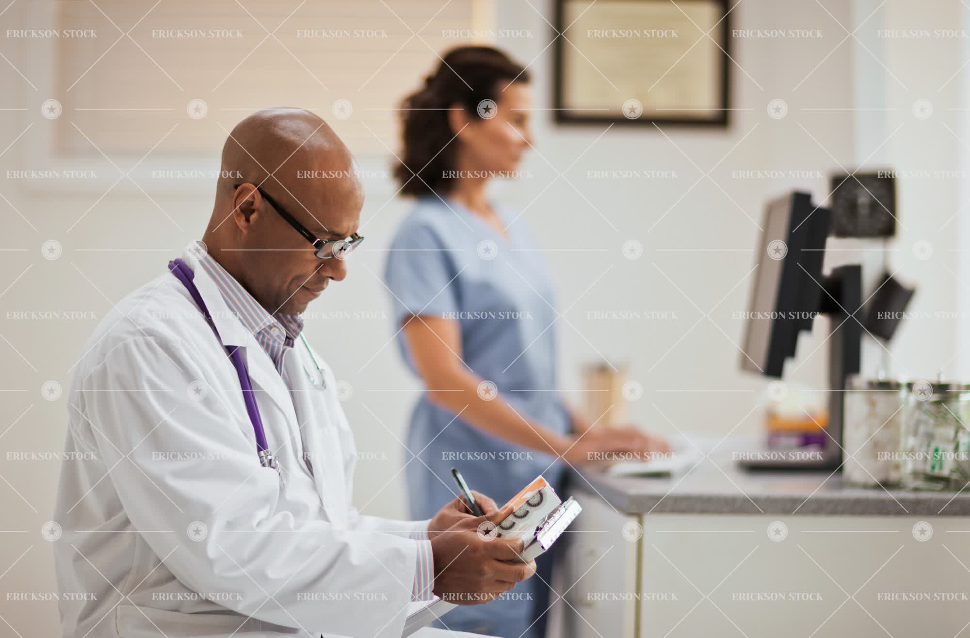 Tags adult, african american, assist, background people, bald, brainstorming, brunette, care, caucasian, clinic, clipboard, colleague, communicate, computer, computer monitor, concentrate, connect, copy space, desk, desktop computer, diploma, doctor, doctor's office, expert, expertise, experts, eyeglasses, female, glasses, half length, health, healthcare, help, helping, horizontal, hospital, hospitals, ideas, indoor, indoors, inside, job, jobs, lab coat, lab coats, long hair, male, man, mature adult, md, medical, medical equipment, medical instrument, medical practitioner, medical practitioners, medication, medicine, mid adult, monitor, monitors, negative space, note, notes, noting, nurse, nurses, occupation, occupations, pen, pens, people, people in the background, person, pharmaceutical, physician, physicians, place of work, practitioner, reading, Screen, screens, scrubs, selective focus, shaved head, specialist, specialists, spectacles, stethoscope, stethoscopes, take note, taking notes, team, Teamwork, technology, thinking, thoughtful, together, two people, uniform, uniforms, use computer, using computer, waist up, window, woman, work, working, write, writing
