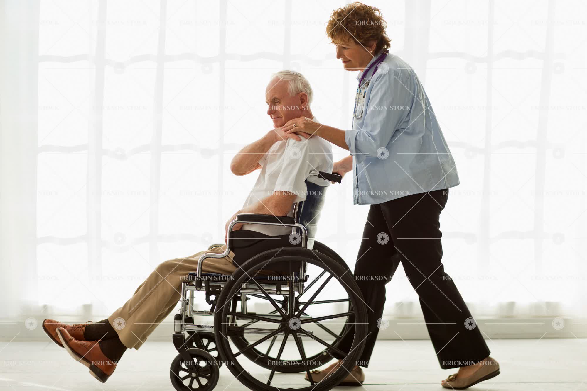 Tags adult, assist, authority, button down shirt, care, casual clothes, caucasian, collared shirt, comfort, console, disabled, doctor, elderly, female, full length, gray hair, grey hair, hand on shoulder, handicapped, hands on shoulders, home, home interior, home interiors, homes, horizontal, house, house interior, house interiors, houses, ill, illness, indoor, indoors, inside, interior, interiors, male, man, mature adult, mid adult, old, patient, patients, people, person, physical impairment, problems, retired, retirement, selective focus, senior adult, shirt, shirts, short hair, sick, sickness, Side view, t-shirt, t-shirts, tee shirt, tee shirts, together, togetherness, two people, wheelchair, wheelchairs