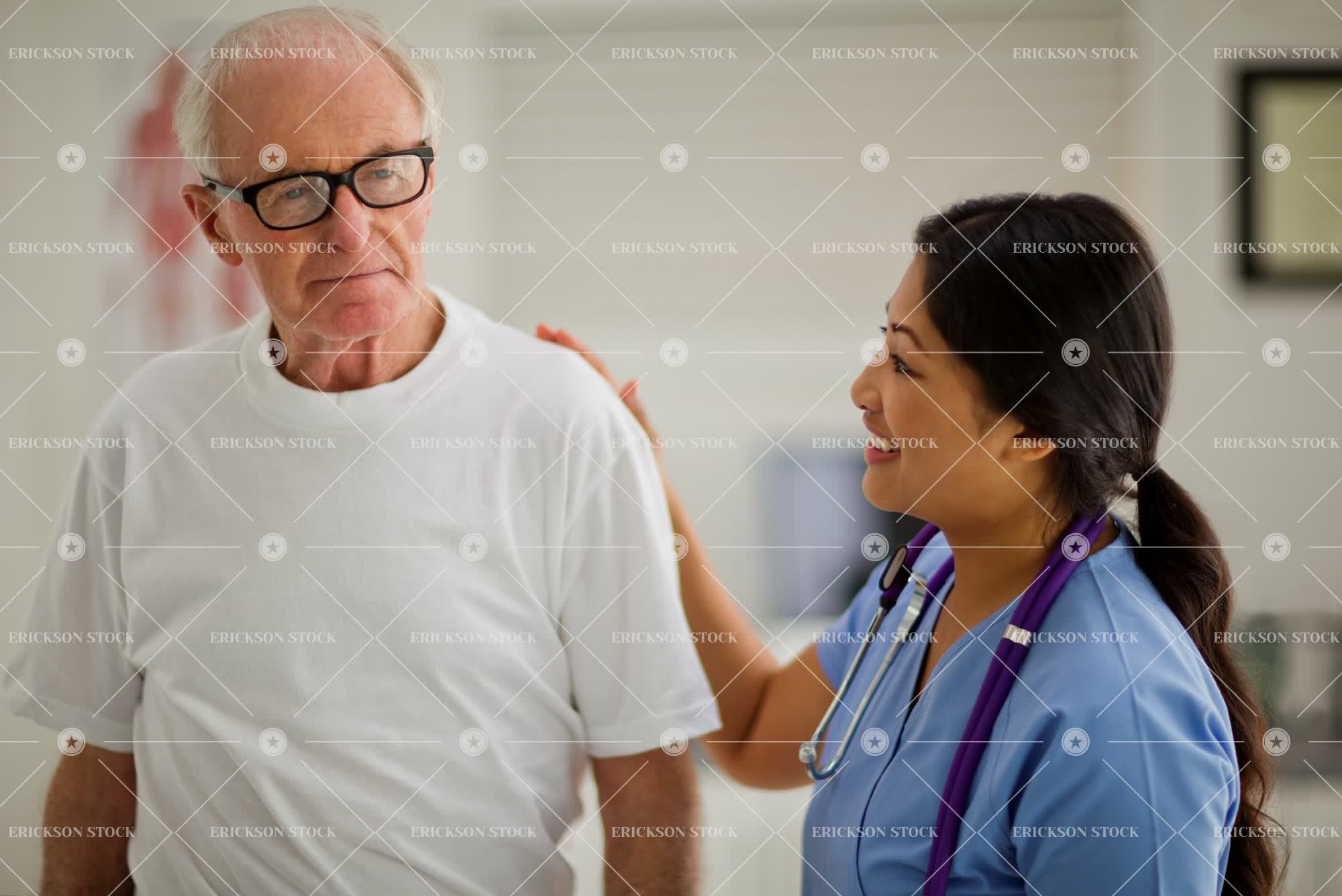 Tags adult, asian, assist, authority, brunette, care, casual clothes, caucasian, cheerful, clinic, comfort, console, copy space, delight, doctor, doctor's office, elderly, enjoyment, exam, examination, exams, expert, expertise, experts, expressing positivity, eyeglasses, female, glasses, gray hair, grey hair, hair tied up, half length, hand on shoulder, hands on shoulders, happiness, happy, head, head & shoulders, head and shoulders, head shot, headshot, health, healthcare, help, helping, horizontal, hospital, hospitals, ill, illness, indoor, indoors, inside, joy, joyful, male, man, mature adult, md, medical, medical equipment, medical exam, medical instrument, medical practitioner, medical practitioners, medicine, mid adult, negative space, old, patient, patients, people, person, physician, physicians, ponytail, positive, positivity, problems, selective focus, senior adult, shoulders, sick, sickness, smile, smiling, specialist, specialists, spectacles, stethoscope, stethoscopes, t-shirt, t-shirts, tee shirt, tee shirts, together, togetherness, two people, waist up, woman, young adult