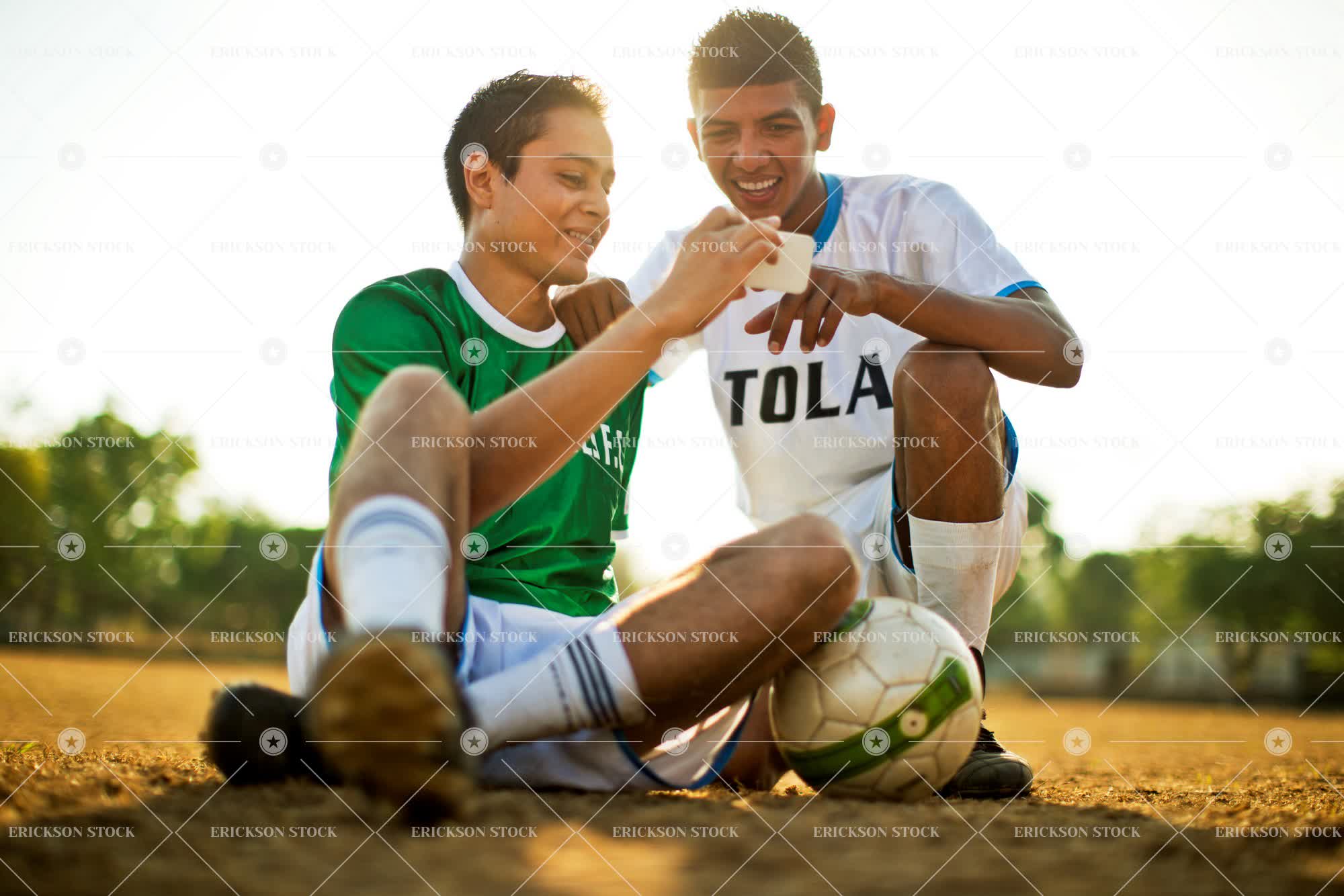 Tags adult, ball, black hair, bond, brunette, cell phone, cheerful, communicate, competition, connect, crouch, day, delight, demonstrate, display, enjoyment, field, fields, football, football player, football players, friend, friends, friendship, full length, Fun, grip, gripping, grips, happiness, happy, having fun, hold, holding, holds, horizontal, joy, joyful, latin american, leisure, leisure activities, leisure activity, male, man, message, messaging, mobile, mobile phone, mobile phones, mobiles, Networking, outdoor, outdoors, outside, people, person, phone, phones, playing field, playing fields, recreation, recreational pursuit, recreational pursuits, selective focus, short hair, Shorts, showing, sit, sitting, smart phone, smartphone, smile, smiling, soccer, soccer ball, soccer player, soccer players, social network, social networking, social networks, sport, Sports, sports clothing, sports field, sports fields, sports uniform, sports uniforms, sportswear, t-shirt, t-shirts, technology, tee shirt, tee shirts, teenager, text message, text messaging, texting, together, togetherness, two people, uniform, uniforms, wireless technology, young adult