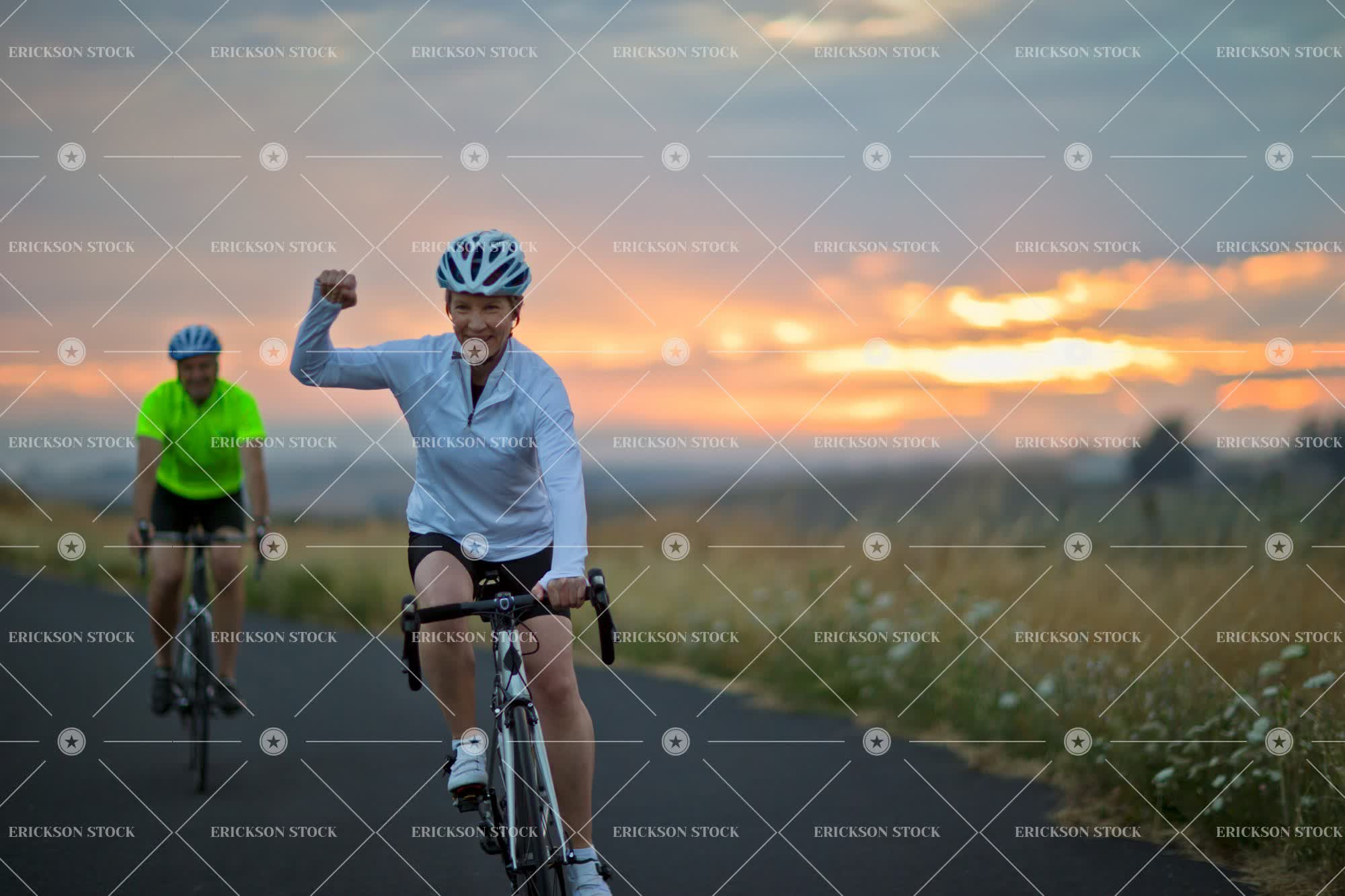 Tags action, active, adult, arm raised, bicycle helmet, bicycle shorts, bike, blond, caucasian, cheerful, copy space, country, country road, countryside, couple, day, delight, dusk, enjoyment, evening, exercise, exercises, exercising, Eye contact, female, fitness, full length, Fun, hand raised, hands raised, happiness, happy, having fun, health, healthy, healthy life, healthy lifestyle, healthy living, helmet, helmets, heterosexual, heterosexual couple, heterosexual couples, horizontal, Husband, husband and wife, husbands, jersey, joy, joyful, leisure, leisure activities, leisure activity, lifestyle, lifestyles, look at camera, looking at camera, male, man, marriage, married, mature adult, mid adult, motion, moving, negative space, next to, on the move, outdoor, outdoors, outside, partner, people, person, portrait, Portraits, recreation, recreational pursuit, recreational pursuits, relationship, relationships, ride, rides, riding, road, road bike, roads, rural, rural road, rural roads, safety helmet, safety helmets, selective focus, senior adult, Shorts, side by side, sit, sitting, smile, smiling, sport, Sports, sports clothes, sports clothing, sportswear, spouse, spouses, sundown, sunset, transport, Transportation, twilight, two people, vitality, weekend, well-being, wellbeing, wellness, wife, wives, woman