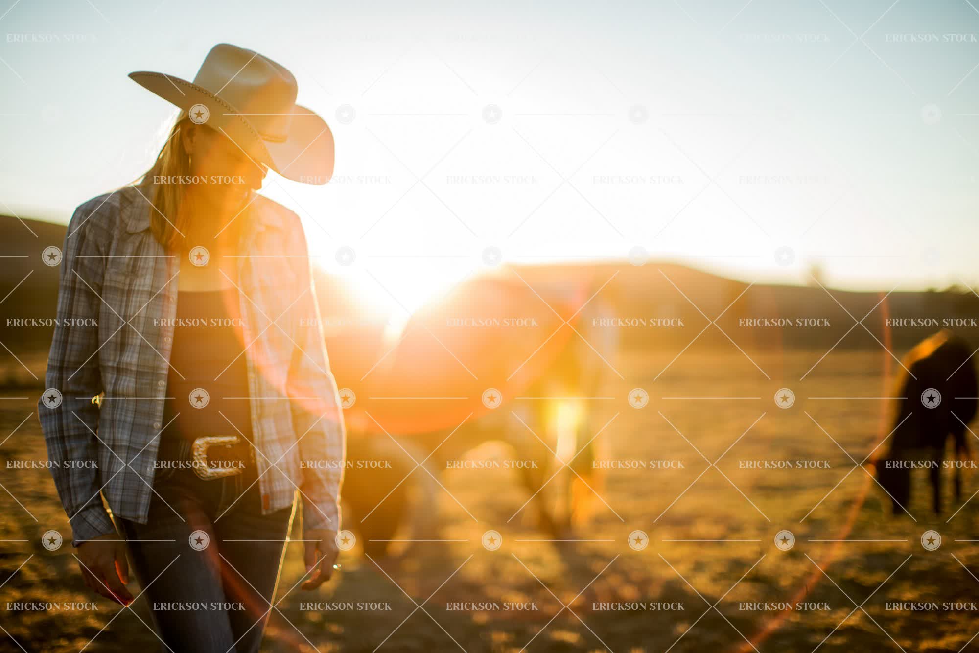 Mid adult woman walking through cattle pasture on a ranch at sunset