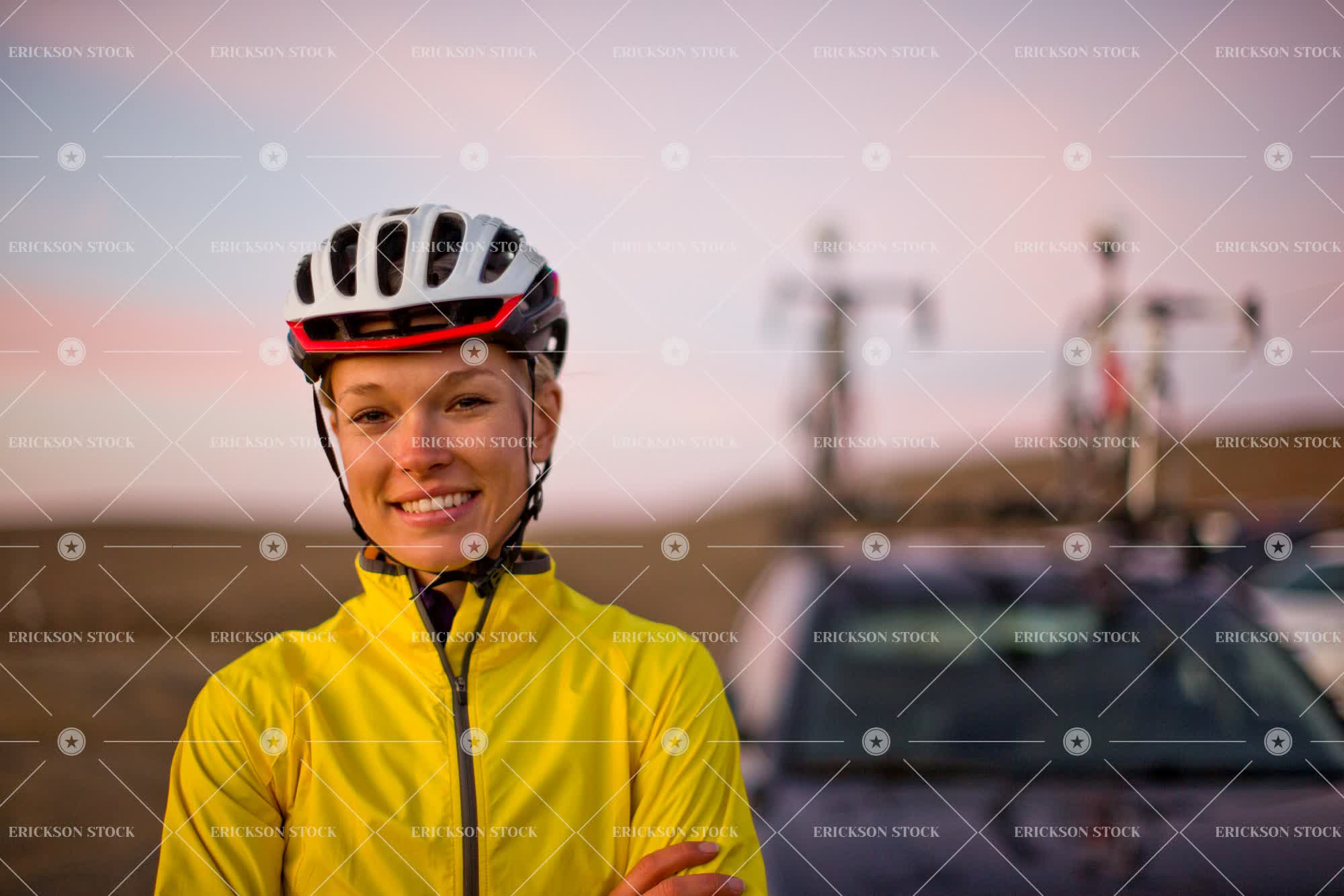 Tags active, adult, arms crossed, athletic, bicycle helmet, bike, blond, car, caucasian, cheerful, country, countryside, delight, dusk, enjoyment, evening, exercise, exercises, exercising, Eye contact, female, fit, fitness, focus on foreground, folded arms, half length, happiness, happy, health, healthy, helmet, helmets, horizontal, Jacket, joy, joyful, leisure, leisure activities, leisure activity, look at camera, looking at camera, mid adult, one person, outdoor, outdoors, outside, people, person, ponytail, portrait, Portraits, recreation, recreational pursuit, recreational pursuits, relax, Relaxation, relaxed, relaxes, relaxing, ride, rides, riding, roof rack, rural, safety helmet, safety helmets, selective focus, smile, smiling, sports clothing, sportswear, sundown, sunset, towhead, transport, Transportation, twilight, vehicle, vehicles, vitality, waist up, woman, young adult