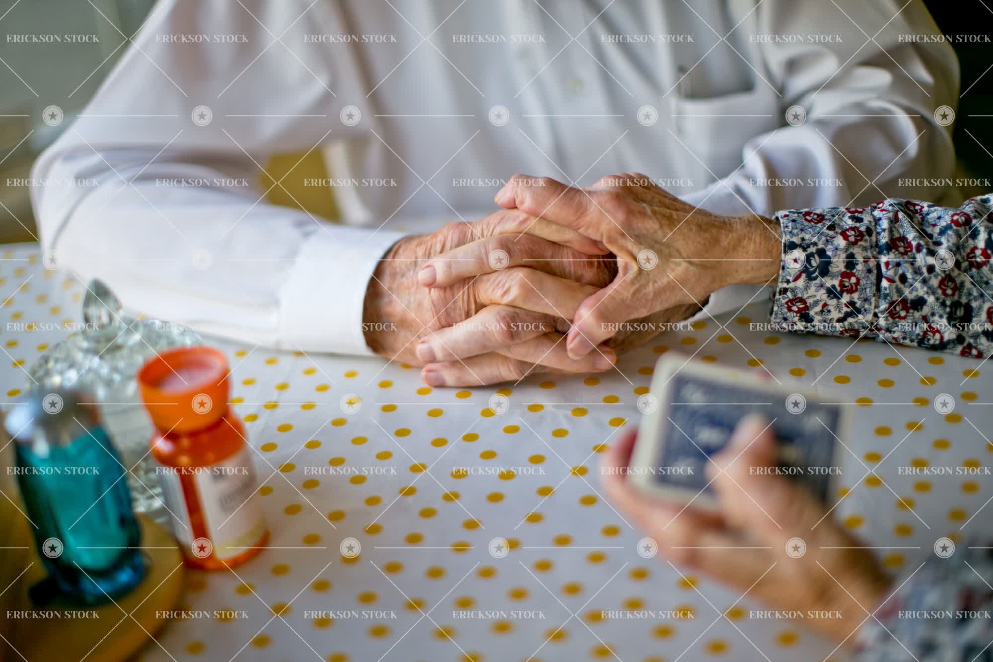 Tags active senior, adult, affectionate, aging, bond, card, card game, casual, casual clothes, caucasian, close up, couple, cropped, elderly, female, Fun, game, games, hand, hand in hand, Hands, hands clasped, hands together, happiness, happy, having fun, heterosexual, heterosexual couple, heterosexual couples, high angle, high angle view, hobbies, hobby, holding hand, Holding hands, home, home interior, home interiors, homes, horizontal, house, house interior, house interiors, houses, human hand, Husband, husband and wife, husbands, indoor, indoors, inside, interior, interiors, leisure, leisure activities, leisure activity, line, lined, lines, love, loving, luck, male, man, marriage, married, mature adult, medication, medicine, medicine bottle, medicine bottles, midsection, old, part of, partner, people, person, pill, pill bottle, pill bottles, pills, playing card, playing cards, prescription, prescriptions, recreation, recreational pursuit, recreational pursuits, relationship, relationships, retirement, selective focus, senior adult, senior couple, sit, sits, sitting, Skill, spouse, spouses, table, Tables, together, togetherness, touch, touches, Touching, two people, vitality, wife, wives, woman, wrinkle, wrinkled, wrinkles, wrinkly