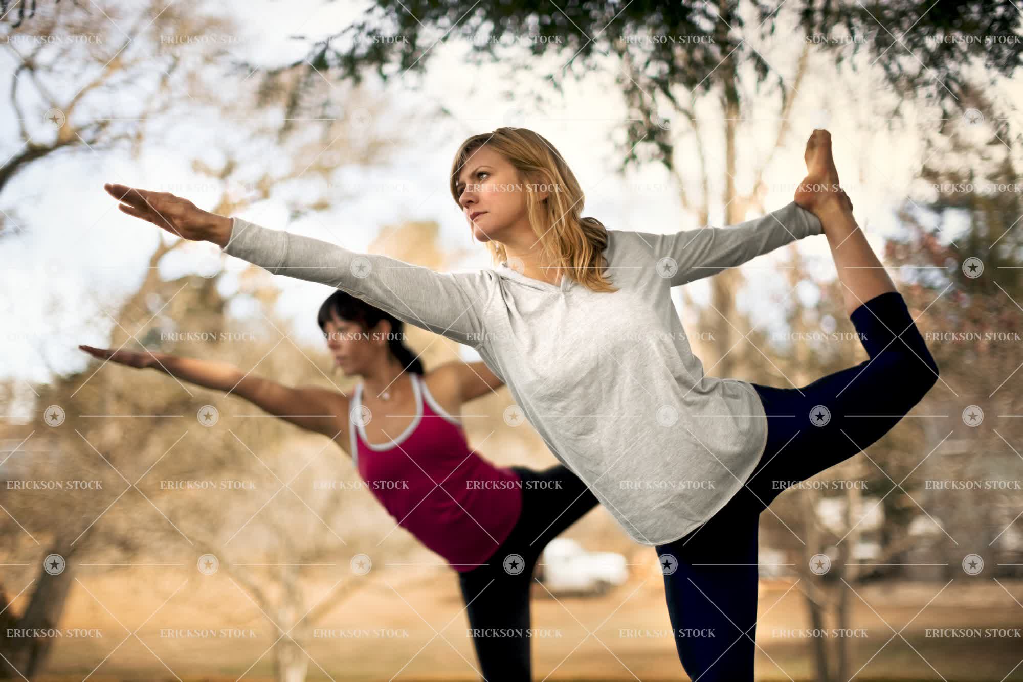 Two women practicing yoga poses in the park