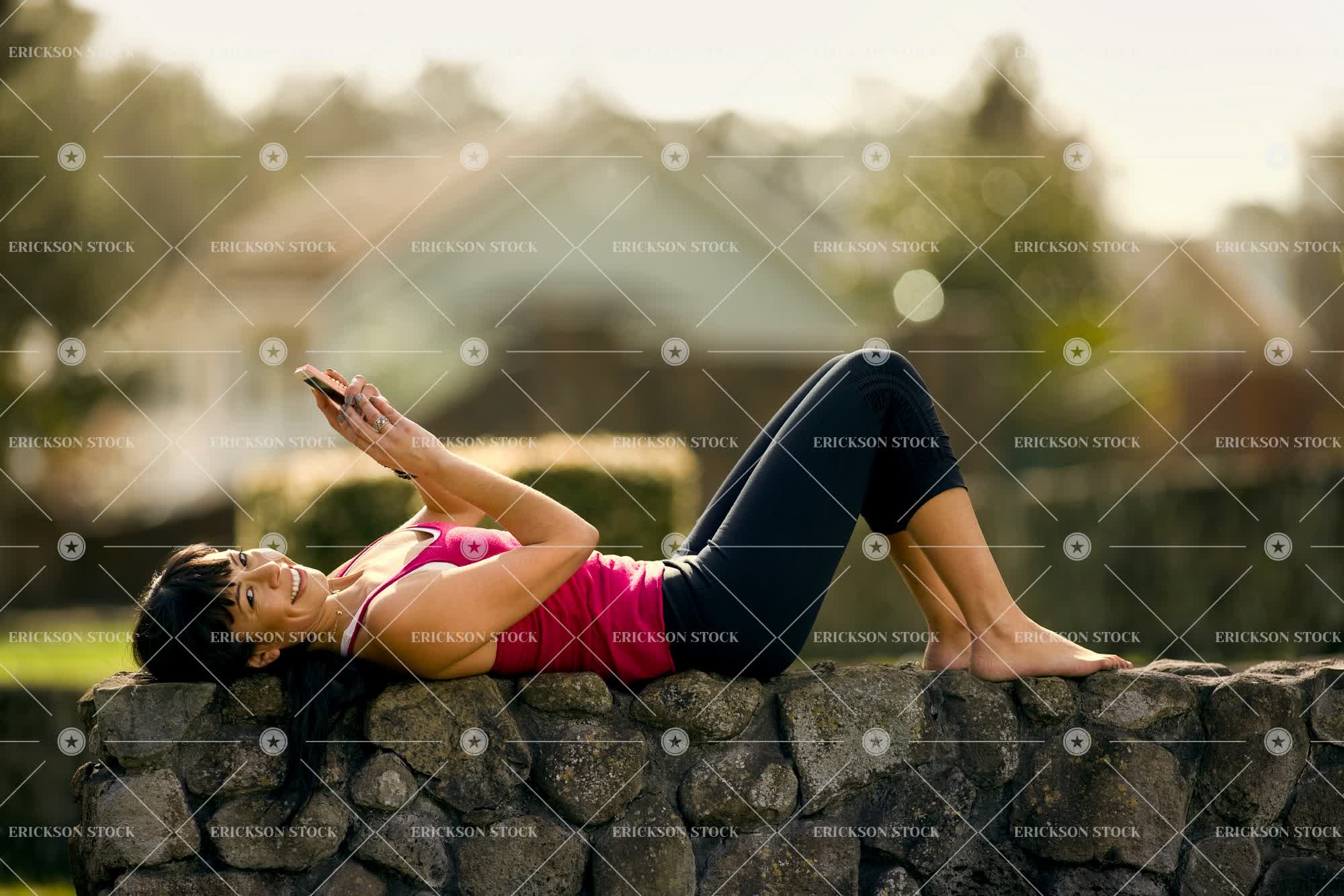 Happy young woman holding a cell phone while relaxing on a stone wall in a rural backyard
