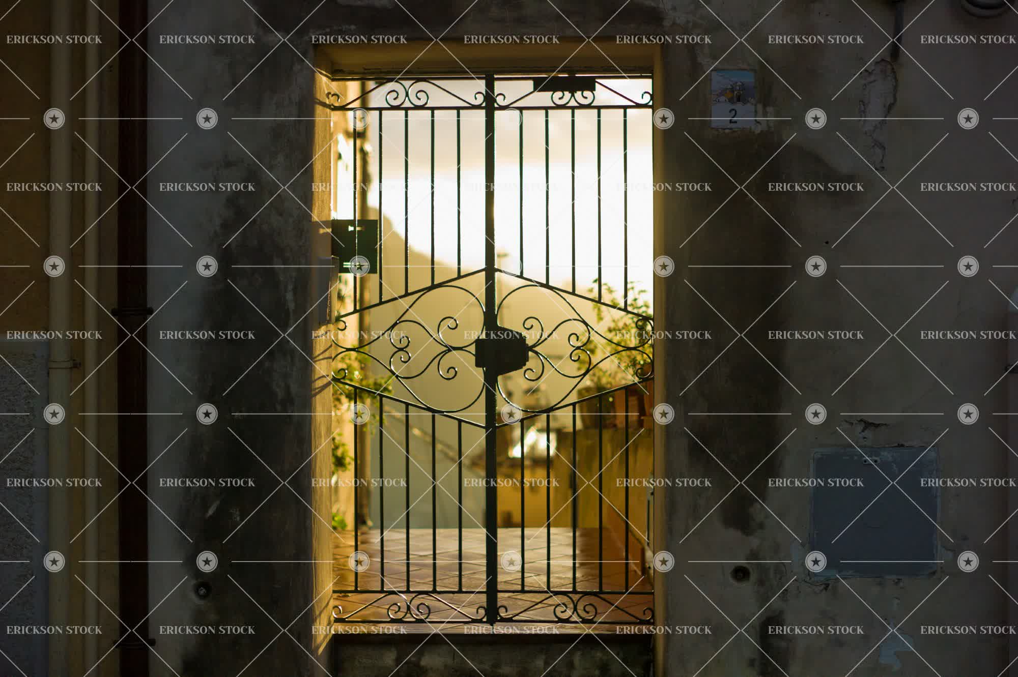 Tags architectural exterior, architecture, building, closing, concrete, dusk, entrance, entrances, entranceway, entranceways, entry, entryway, Europe, european, evening, exterior, Gate, gates, iron, iron gate, italy, locked, nobody, ornate, outdoor, outdoors, outside, porch, selective focus, sundown, sunlight, sunlit, sunset, tile, tiled walkway, twilight, walkway