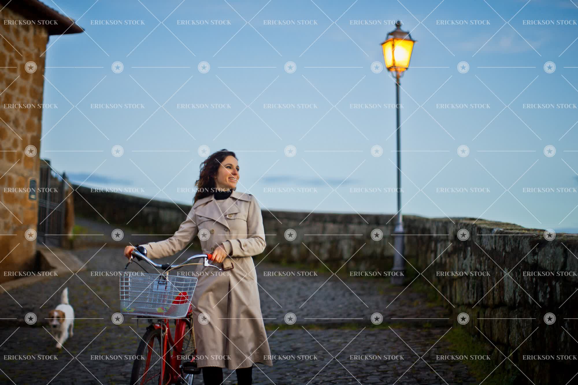 Tags adult, animal, attractive, basket, beautiful, bell, bike, brunette, caucasian, cheerful, coat, cobblestone, content, day, delight, dog, domestic, dusk, enjoyment, evening, exploration, explore, exploring, female, footpath, footpaths, Fun, good looking, handlebars, happiness, happy, having fun, holiday, horizontal, jack russell, joy, joyful, lamp post, lamp posts, lamppost, lampposts, leisure, leisure activities, leisure activity, long hair, look at view, look sideways, looking at view, looking away, looking sideways, mid adult, one animal, one person, outdoor, outdoors, outside, Overcoat, path, paths, pavement, pavements, people, person, pet, pets, pleased, pretty, recreation, recreational pursuit, recreational pursuits, scenic, selective focus, sidewalk, sidewalks, smile, smiling, standing, stone wall, street lamp, street lamps, street light, street lights, streetlamp, streetlight, streetlights, sunset, three quarter length, tourist destination, tourist destinations, transport, Transportation, travel, travel destination, travel destinations, trench coat, trenchcoat, twilight, Vacation, walk, Walking, walks, wavy hair, woman, young adult