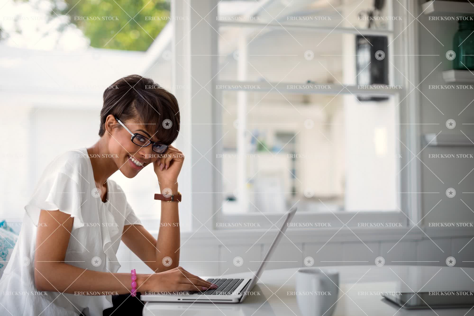 Tags adult, african american, blouse, bracelet, brown eyes, brunette, cheerful, coffee, coffee cup, comfort, communicate, computer, connect, copy space, cup, cushion, day, delight, dining room, dining table, drink, e-mail, e-mailing, email, emailing, enjoyment, entrepreneur, Eye contact, eyeglasses, female, focus on foreground, Food and drink, freelance, freelancer, glasses, half length, happiness, happy, home, home interior, home interiors, home office, homes, horizontal, house, house interior, house interiors, houses, indoor, indoors, inside, interior, interiors, internet, joy, joyful, kitchen table, laptop, laptop computer, laptop computers, laptops, look at camera, looking at camera, mid adult, mixed race, mug, multi ethnic groups, multi-ethnic group, negative space, notebook, notebooks, one person, onl, online, people, person, pillow, pillows, portrait, relaxed, selective focus, short hair, short sleeved, sit, sitting, small biz, small business, smile, smiling, table, tablet, technology, telecommute, telecommuting, top, waist up, Watch, window, window seat, windows, wireless, wireless technology, woman, work from home, working from home, young adult