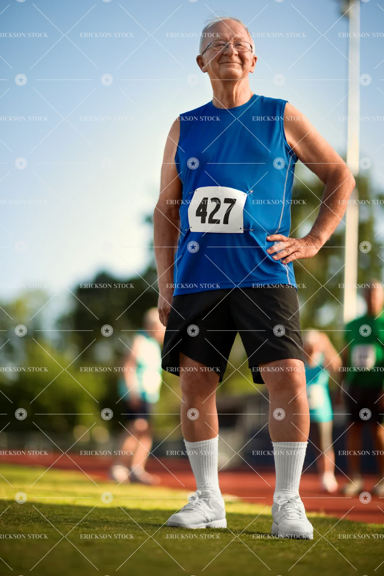 Tags active, adult, aging, athletic, bald, balding, caucasian, confident, day, elderly, exercise, exercising, Eye contact, eyeglasses, fit, fitness, glasses, grass, gray hair, happy, health, healthy, horizontal, jersey, looking at camera, man, mature adult, number, obscured, outdoor, outside, people in background, person, race, recreation, run, runner, Running, selective focus, senior adult, shoes, Shorts, sport, sportswear, stand, tank top, track, vitality, wellness