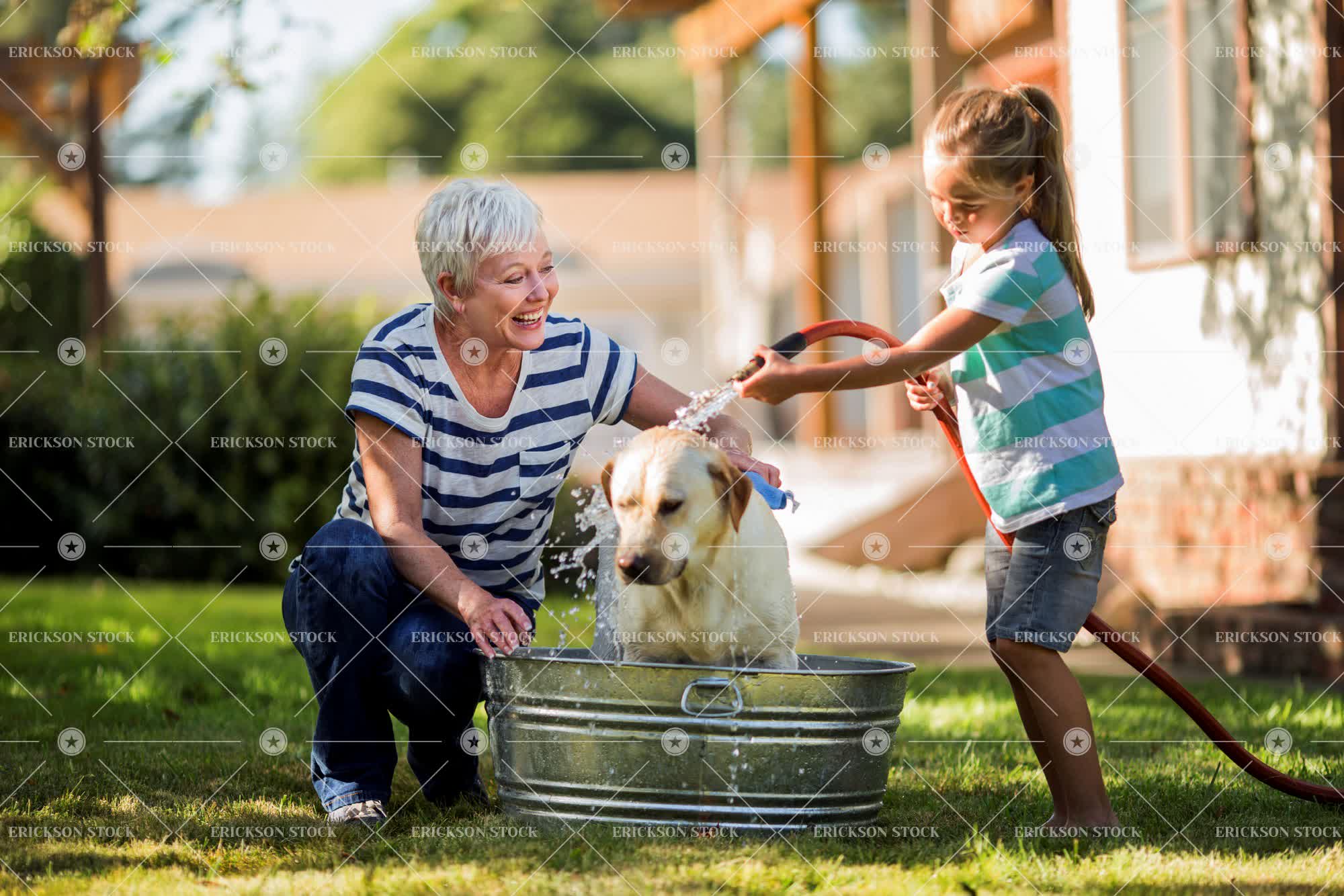 Tags adult, animal, backyard, bath, bathe, blond, bond, caucasian, child, clean, crouch, day, denim, dog, domestic, elementary age, family, female, front yard, girl, grandchild, granddaughter, grandmother, grandparent, grass, happy, horizontal, hose, house, mature adult, outdoors, people, pet, senior adult, Shorts, smiling, spray, spraying, Squatting, striped, suburban, t-shirt, together, tub, wash, Washing, water, wet, woman