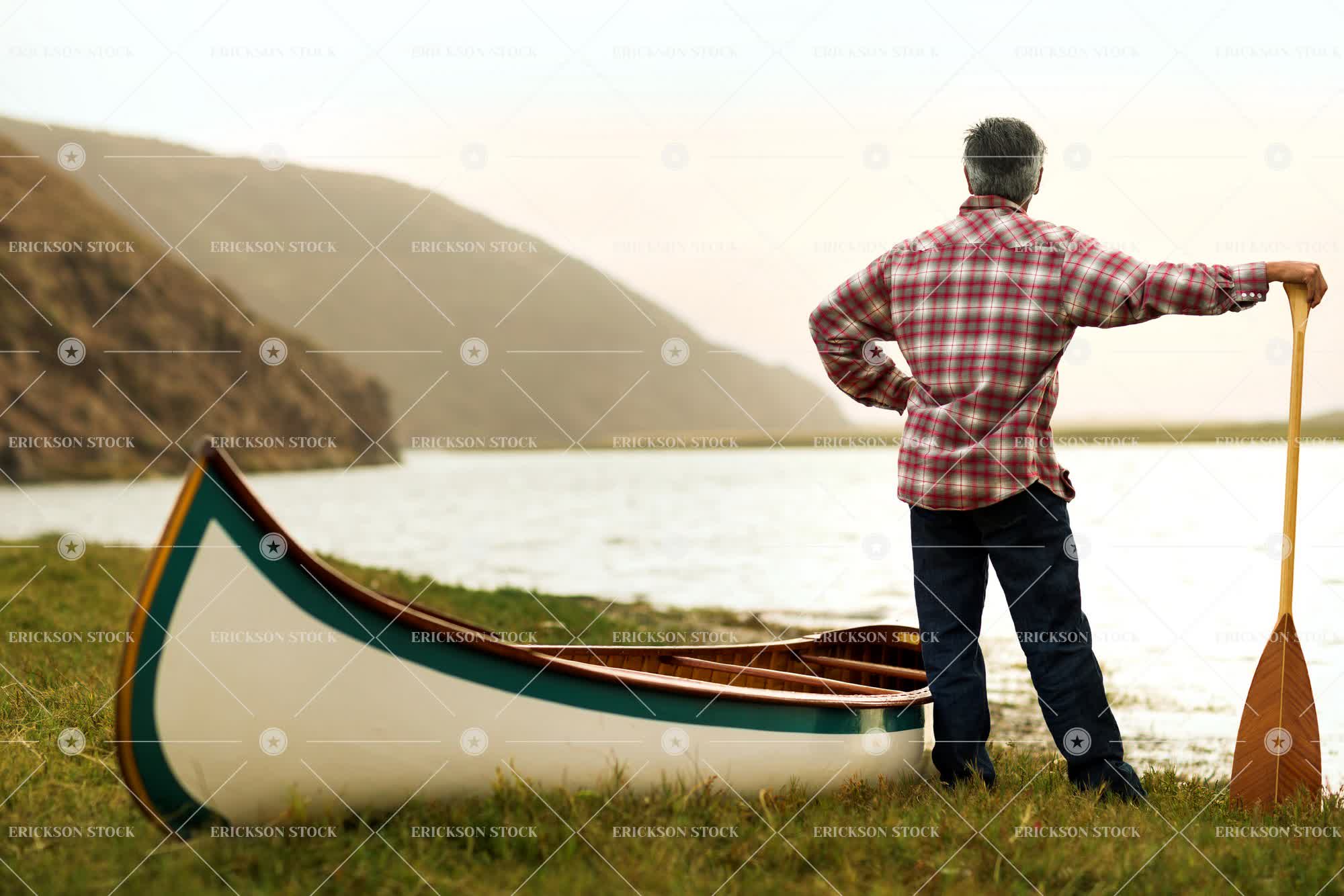 Tags active, adult, back, beautiful, boat, canoe, caucasian, day, denim, flannel, gray hair, grey hair, hand on hip, hill, horizontal, jeans, Lake, Landscape, latin american, leisure, male, man, mature adult, natural, nature, Oar, one person, outdoors, outdoorsman, paddle, person, plaid, pond, rear view, recreation, scenery, scenic, selective focus, senior adult, shore, solitary, solitude, standing, water