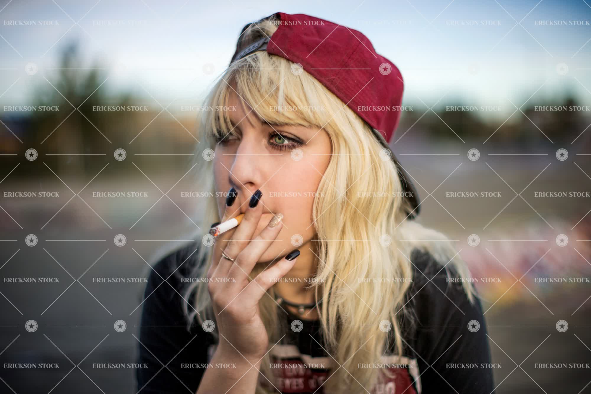 Tags adult, blond, cap, casual, casual clothes, caucasian, cigarette, college, day, female, focus on foreground, graphic shirt, green eyes, head, head and shoulders, horizontal, inhale, inhaling, look away, looking away, makeup, mid adult, nail polish, one person, outdoor, outdoors, outside, person, selective focus, shirt, shoulders, smoking, suburban, suburbs, tobacco, towhead, woman, young adult
