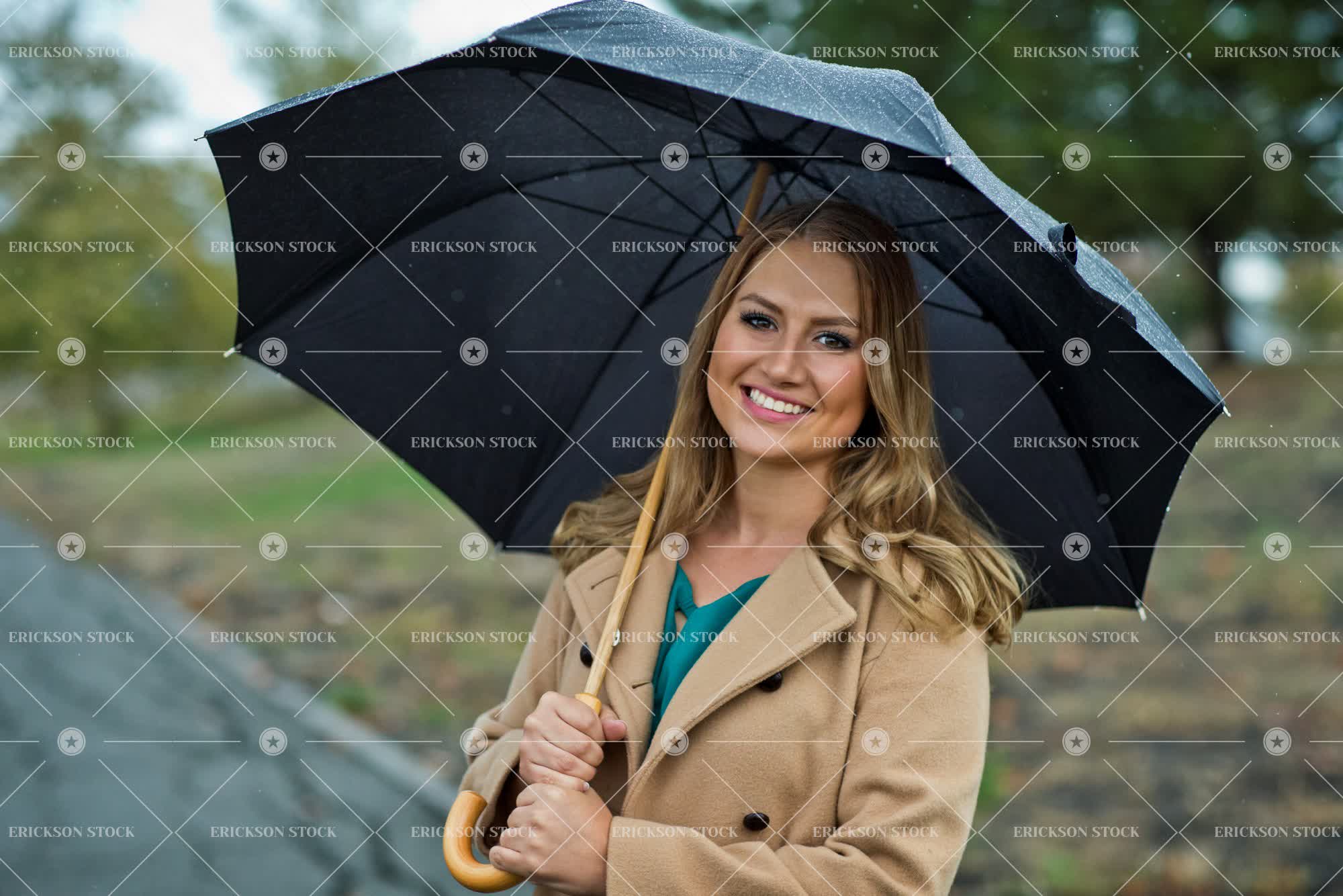 Tags adult, attractive, autumn, blond, brown eyes, caucasian, cheerful, close up, college, day, Eye contact, fall, female, footpath, happy, head shot, horizontal, long hair, looking at camera, mid adult, outdoor, outdoors, pavement, person, rain, raining, rainy, road, selective focus, sidewalk, smile, smiling, standing, street, umbrella, weather, wet, woman, wool coat, young adult