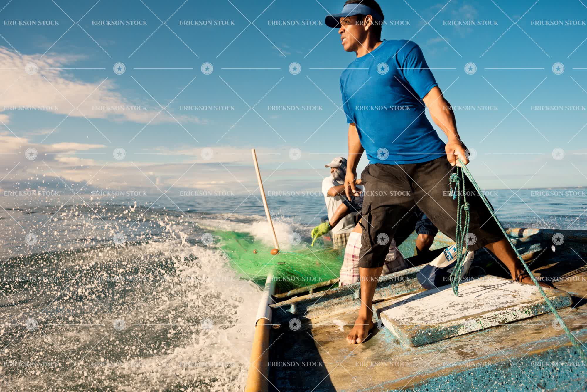 Tags adult, arm, barefoot, boat, cap, cropped, day, fisherman, fishermen, fishing, fishing boat, fishing industry, fishing net, fishing nets, hat, holding, horizontal, latin american, looking away, male, man, mid adult, net, nets, ocean, outdoors, people, person, rigging, rope, ropes, sea, selective focus, Shorts, skies, sky, splashing, spray, standing, visor, water, work, working, young adult