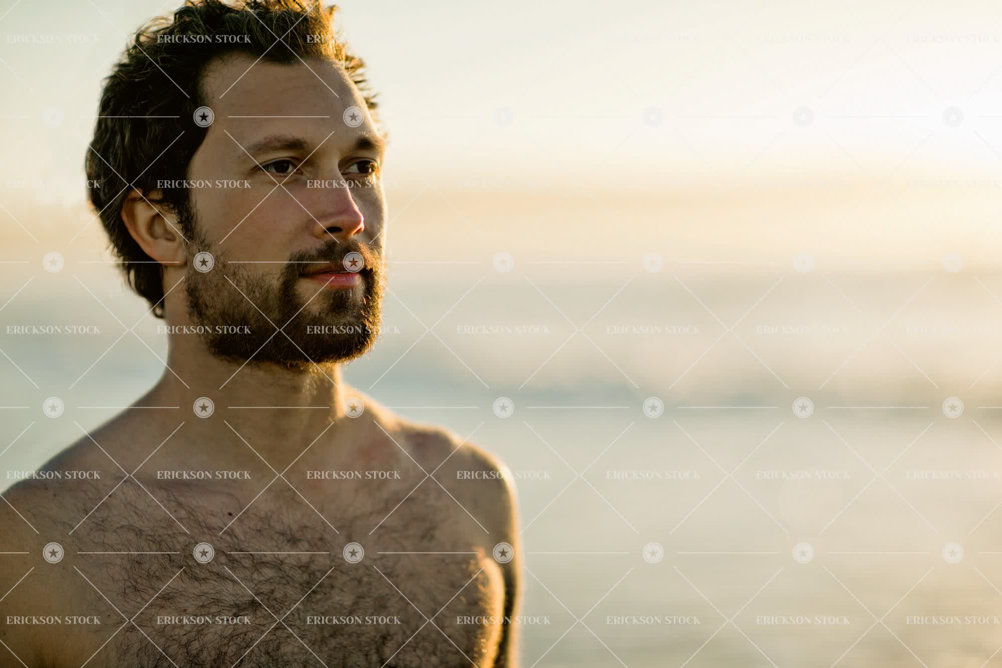 Tags adult, bare chested, beach, beard, brunette, close up, coast, day, dusk, facial hair, head and shoulders, head shot, horizontal, leisure, looking away, looking into the distance, male, man, mid adult, ocean, one person, outdoor, outdoors, person, recreation, sand, sea, seashore, selective focus, shirtless, shore, shoreline, Summer, sundown, sunset, sunshine, Surfer, water, weekend activity, young adult