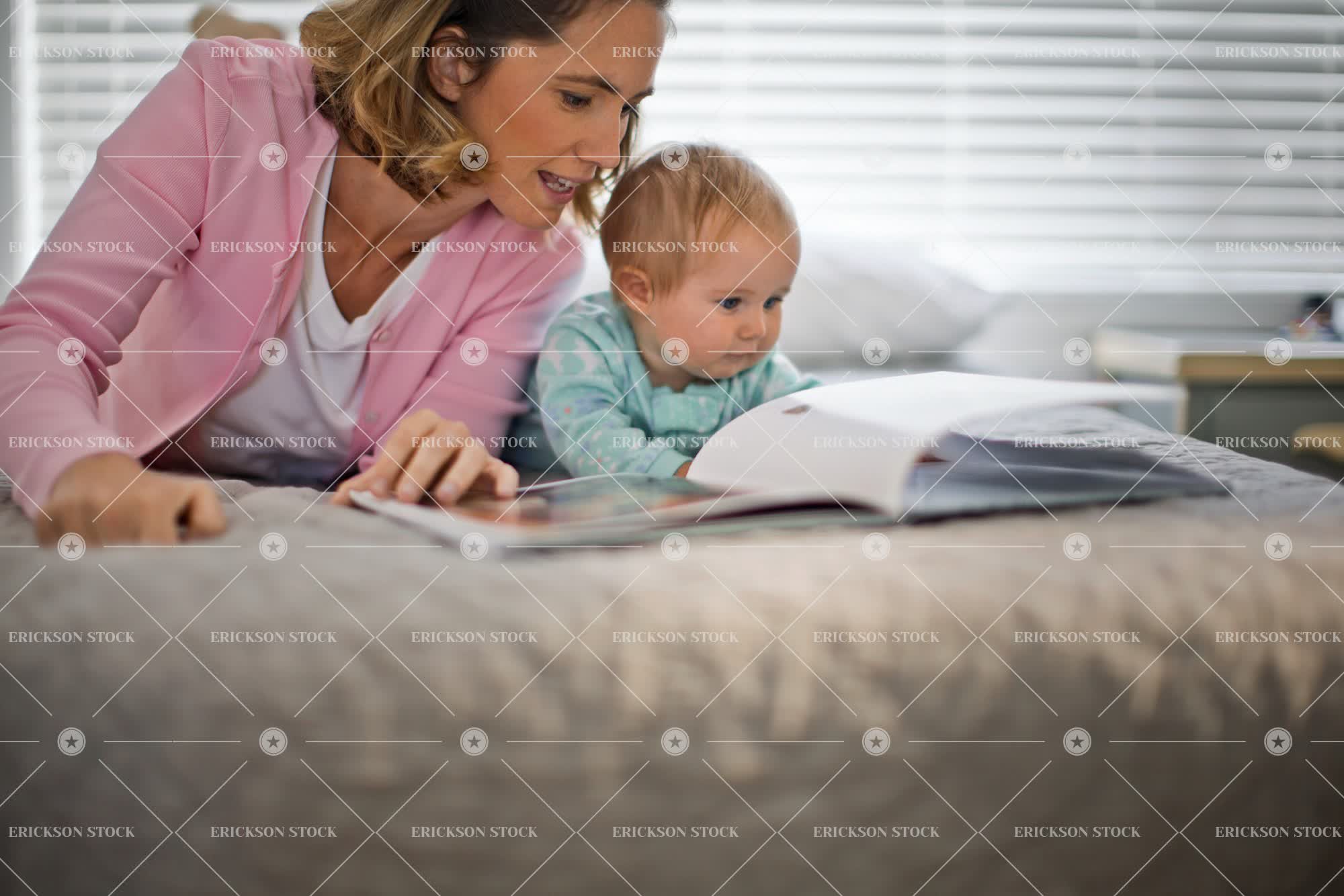 Tags adult, baby, baby girl, bed, bedroom, blond, bond, book, brunette, cardigan, caucasian, child, daughter, family, female, girl, happiness, happy, home, horizontal, indoor, infant, love, loving, Lying down, lying on front, maternal, mid adult, mom, mother, parent, people, picture book, reading, reading aloud, reading stories, reading story, selective focus, short hair, storytelling, sweater, together, togetherness, two people, woman