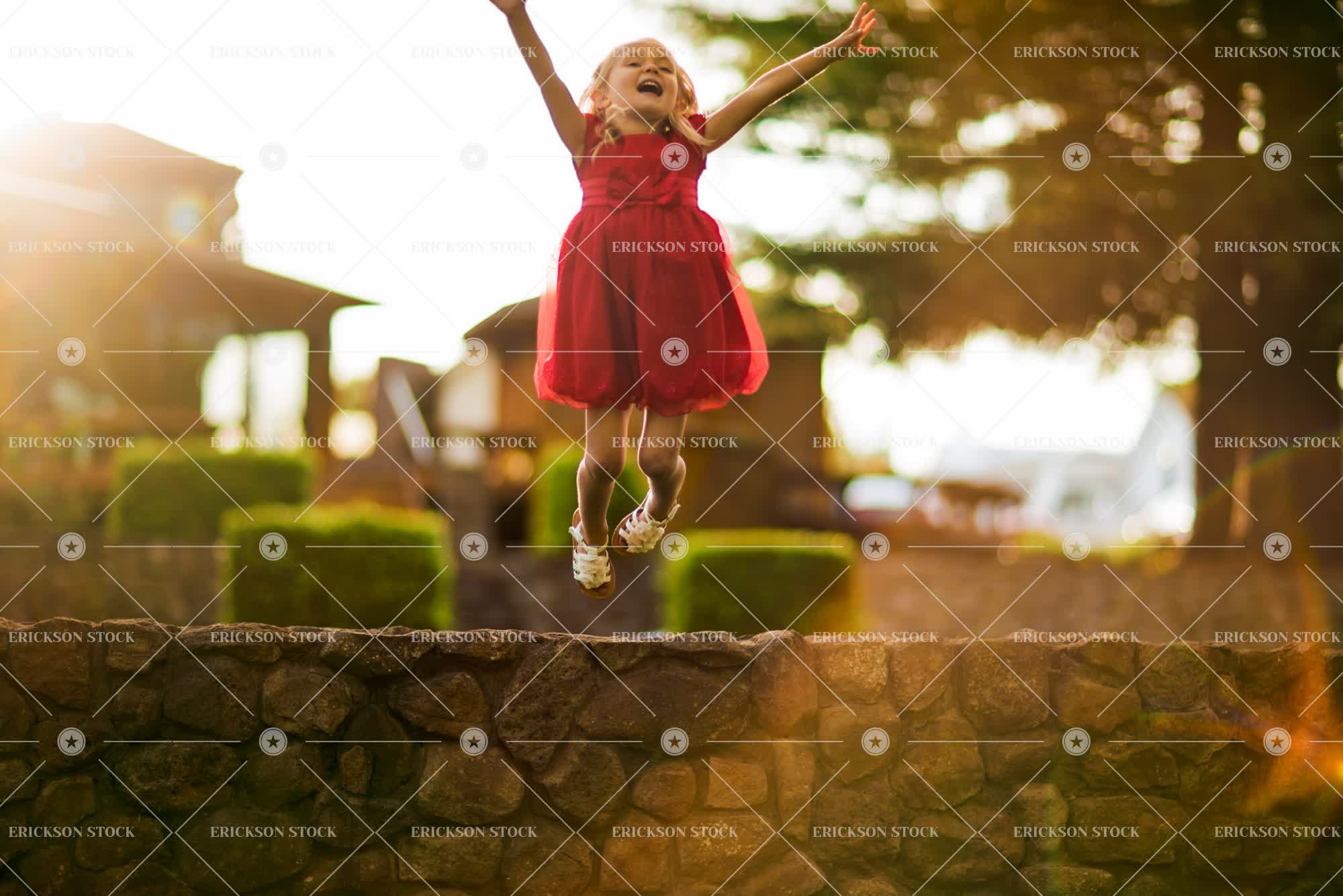 Tags blond, caucasian, cheerful, child, day, dress, full length, Fun, girl, happiness, happy, having fun, horizontal, house, joyful, jump, jumping, leap, leaping, leisure, lens flare, looking away, one person, outdoor, outside, person, play, Playful, Playing, preschool, red dress, sandals, selective focus, smile, smiling, solar flare, stone, stone wall, sun, sunshine, towhead, Tree, trees