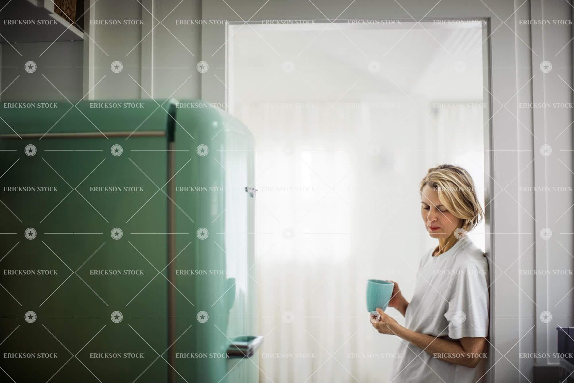 Tags adult, blond, casual, caucasian, coffee, coffee cup, contemplate, cup, day, drink, female, fridge, gloomy, home, horizontal, house, indoor, Kitchen, leaning, looking down, mature adult, melancholy, mid adult, morning, mug, one person, pensive, person, refrigerator, sad, sadness, selective focus, short hair, t-shirt, thinking, thoughtful, unhappy, weekend, woman