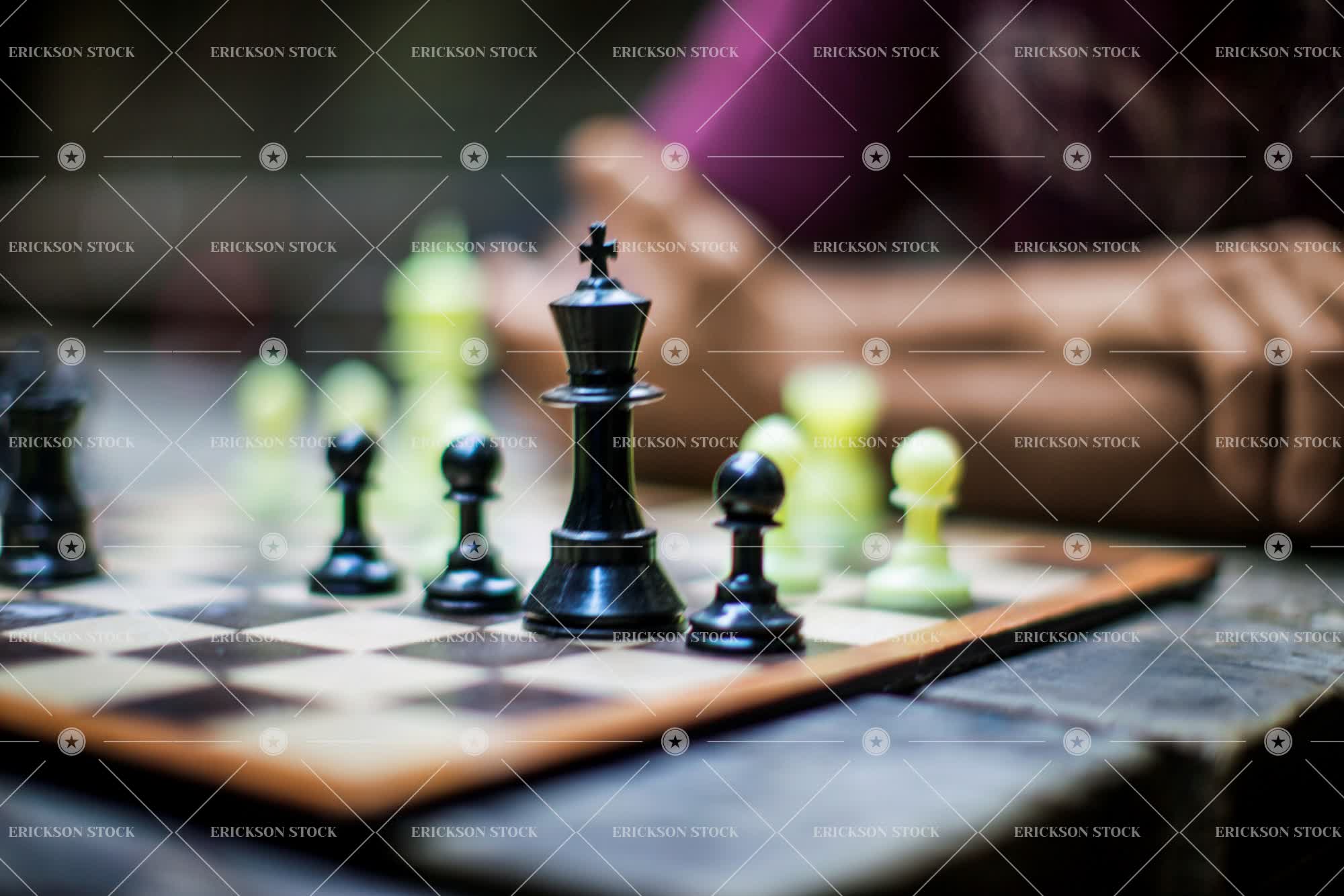 Tags adult, arm, casual, casual clothes, caucasian, chess, close up, cropped, female, focus on foreground, game, game of chess, horizontal, indoor, indoors, inside, leisure, man, mid adult, object, one person, pawn, people, person, playing chess, recreation, rook, selective focus, table, woman, young adult