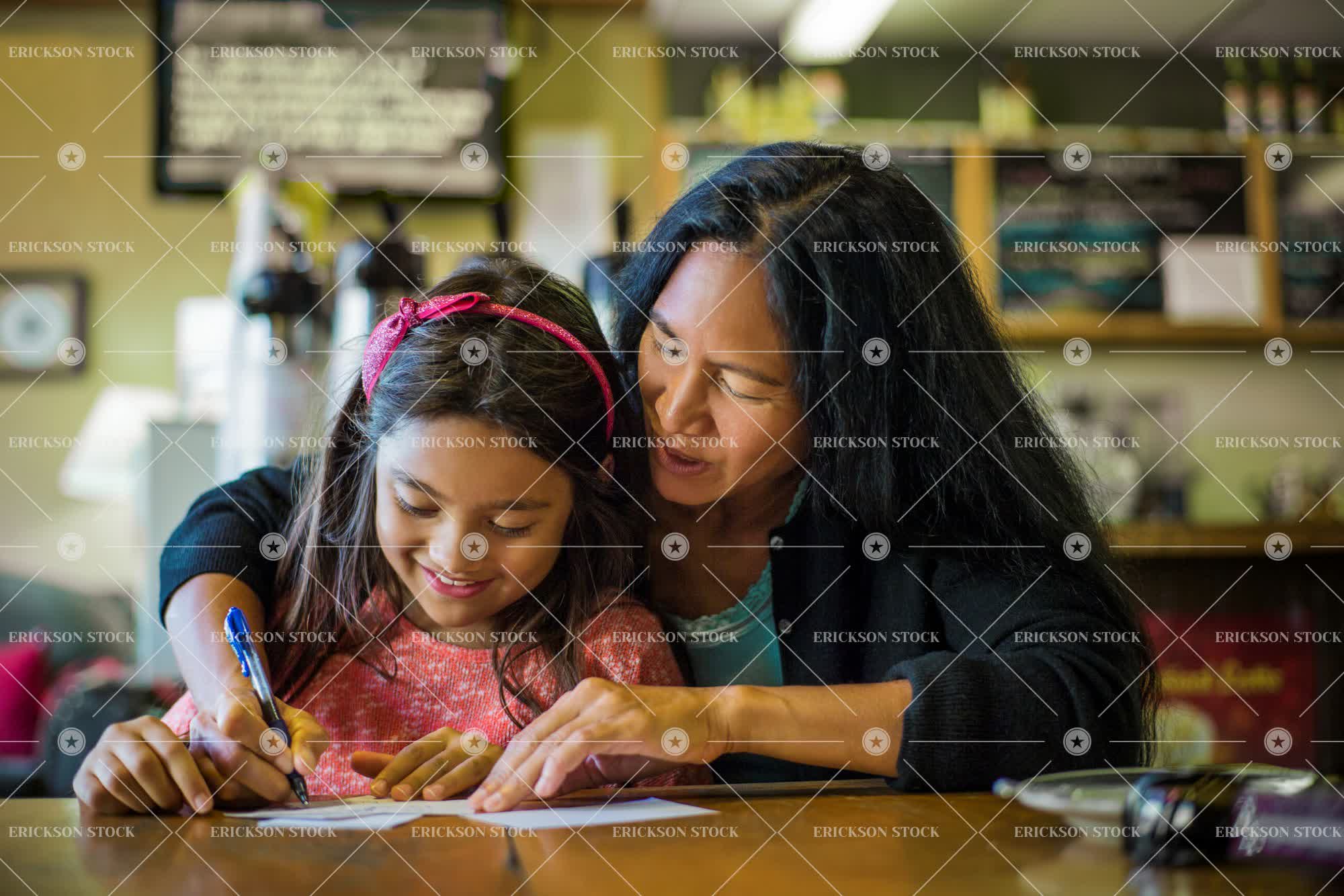Tags adult, arm around, black hair, bond, brunette, cardigan, casual, child, daughter, day, desk, elementary age, family, female, focus on foreground, girl, head band, homework, indoor, inside, learning, long hair, maternal, mid adult, mom, mother, pacific islander, paper, parent, Parenthood, pen, people, polynesian, school work, selective focus, t-shirt, table, tank top, two people, woman, writing