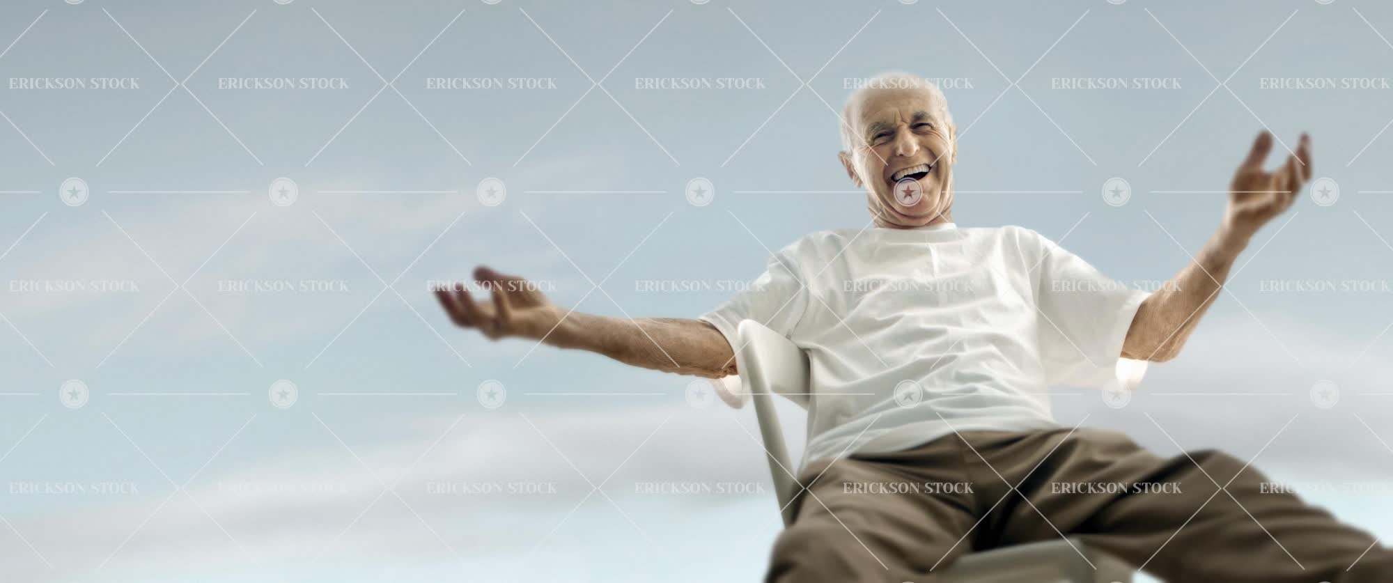 Tags active senior, arm outstretched, caucasian, cloud, composite, copy space, day, Gesturing, happiness, laughing, male, man, manipulated photography, one person, outdoors, panoramic, people, retirement, senior adult, sitting, sky, smiling, three quarter length, view from below, vitality