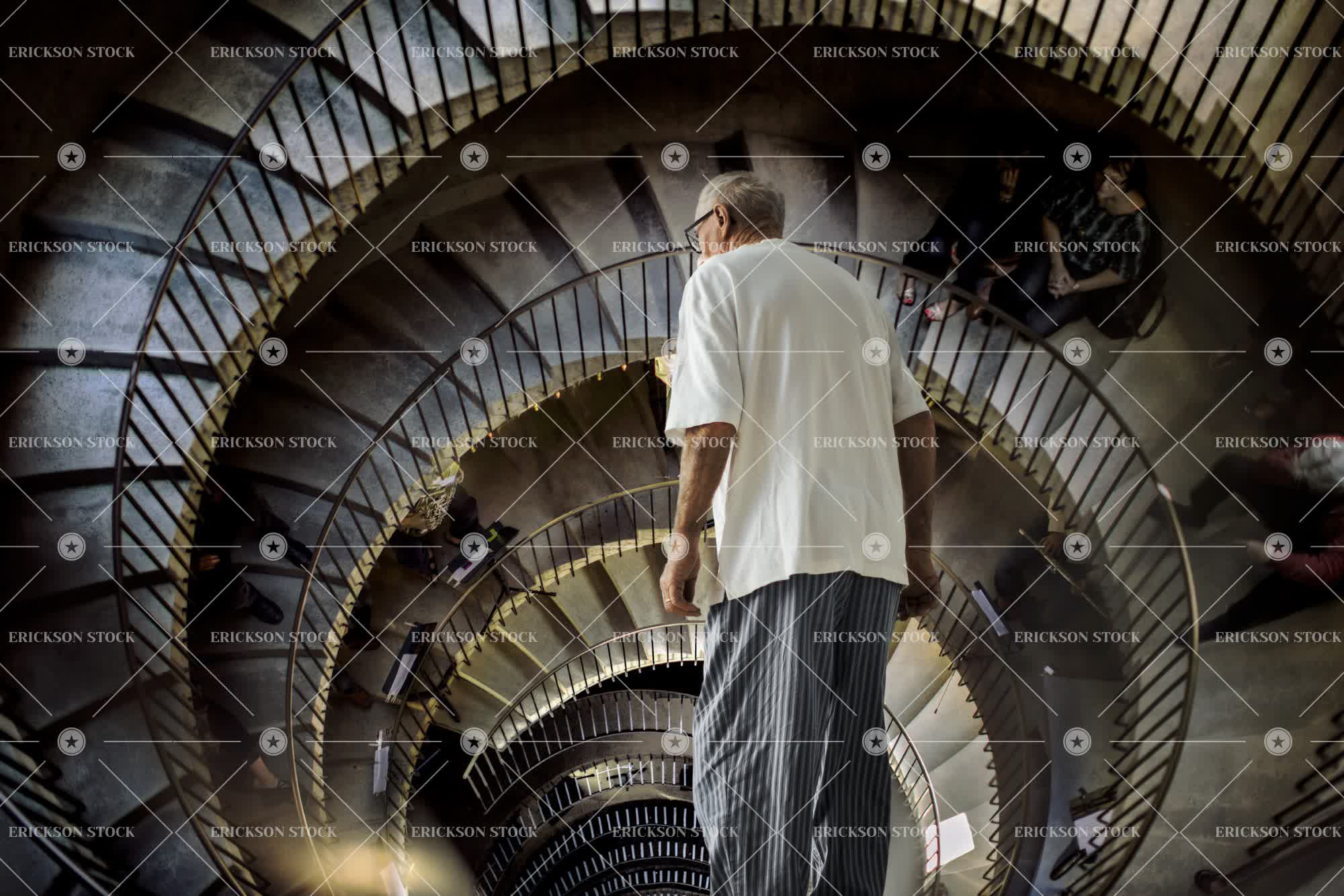 Senior man standing above a spiral staircase in a dream.