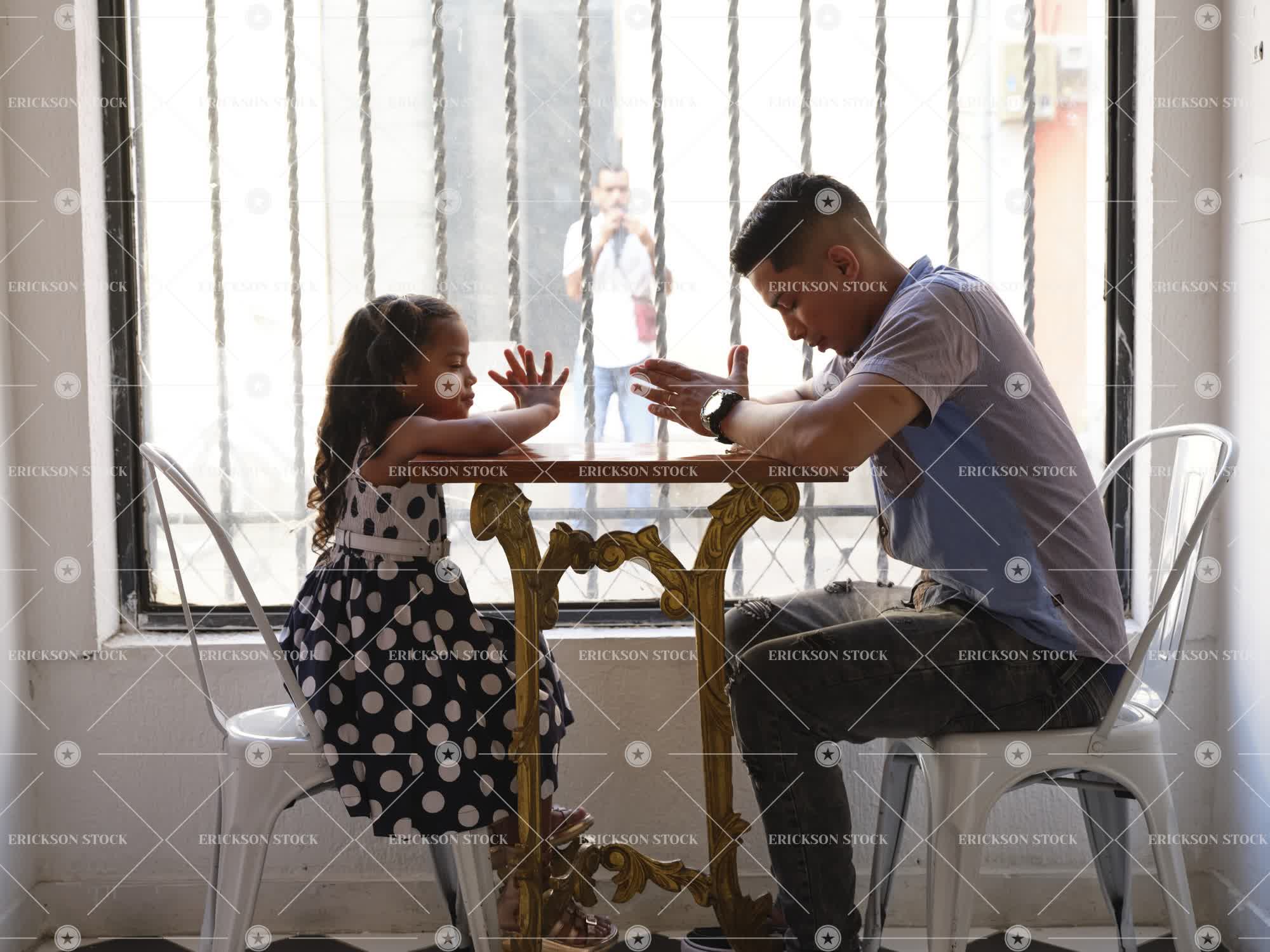 young man and a girl sitting at the table praying