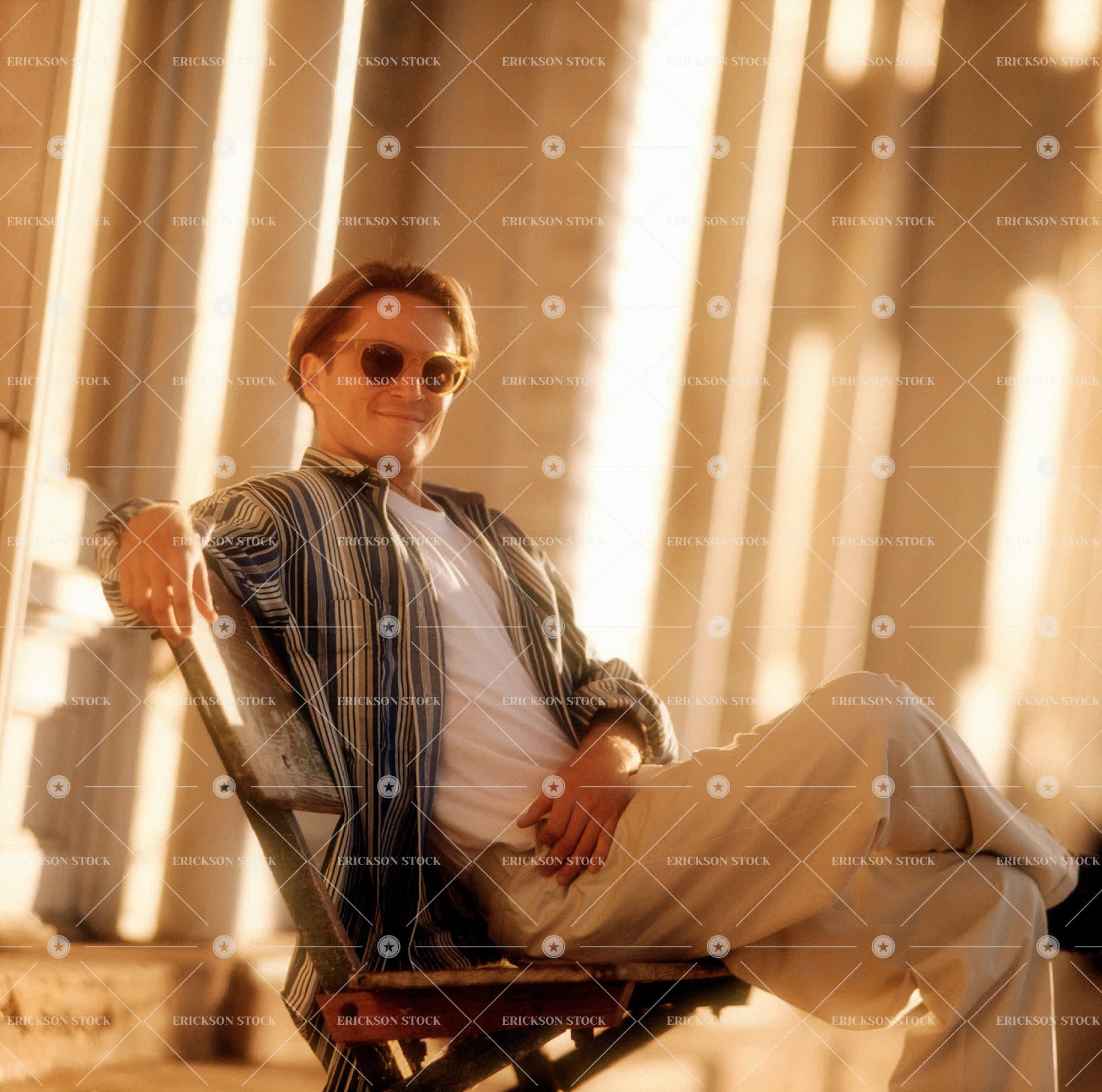 Tags adult, attitude, bliss, caucasian, chair, cheerful, confident, cool, day, delight, enjoyment, eyeglasses, fellow, fellows, furnishing, furnishings, Furniture, gaieties, gaiety, gaily, gay, glad, gladly, gladness, glasses, gleeful, gleefully, gleefulness, gratification, gratifications, gratified, gratify, gratifying, gratifys, guy, guys, happiness, happy, indoors, jollied, jollies, jolly, joy, joyful, joyous, legs crossed, lifestyle, lifestyles, lighthearted, lightheartedly, lightheartedness, living, living being, looking at camera, low angle view, male, man, merriment, merry, object, objects, one person, only males, only men, people, person, persons, pleased, pleasing, pleasure, portrait, Portraits, portraiture, rejoice, rejoiced, rejoices, rejoicing, relax, Relaxation, relaxed, relaxes, relaxing, rest, rested, Resting, rests, sat, satisfaction, satisfied, satisfies, satisfy, satisfying, seat, seated, seating, seats, shade, shades, sit, sits, sitting, smile, smiled, smiles, smiling, spectacles, square image, suave, suaveness, sunglasses, thing, three quarter length, western european, young adult