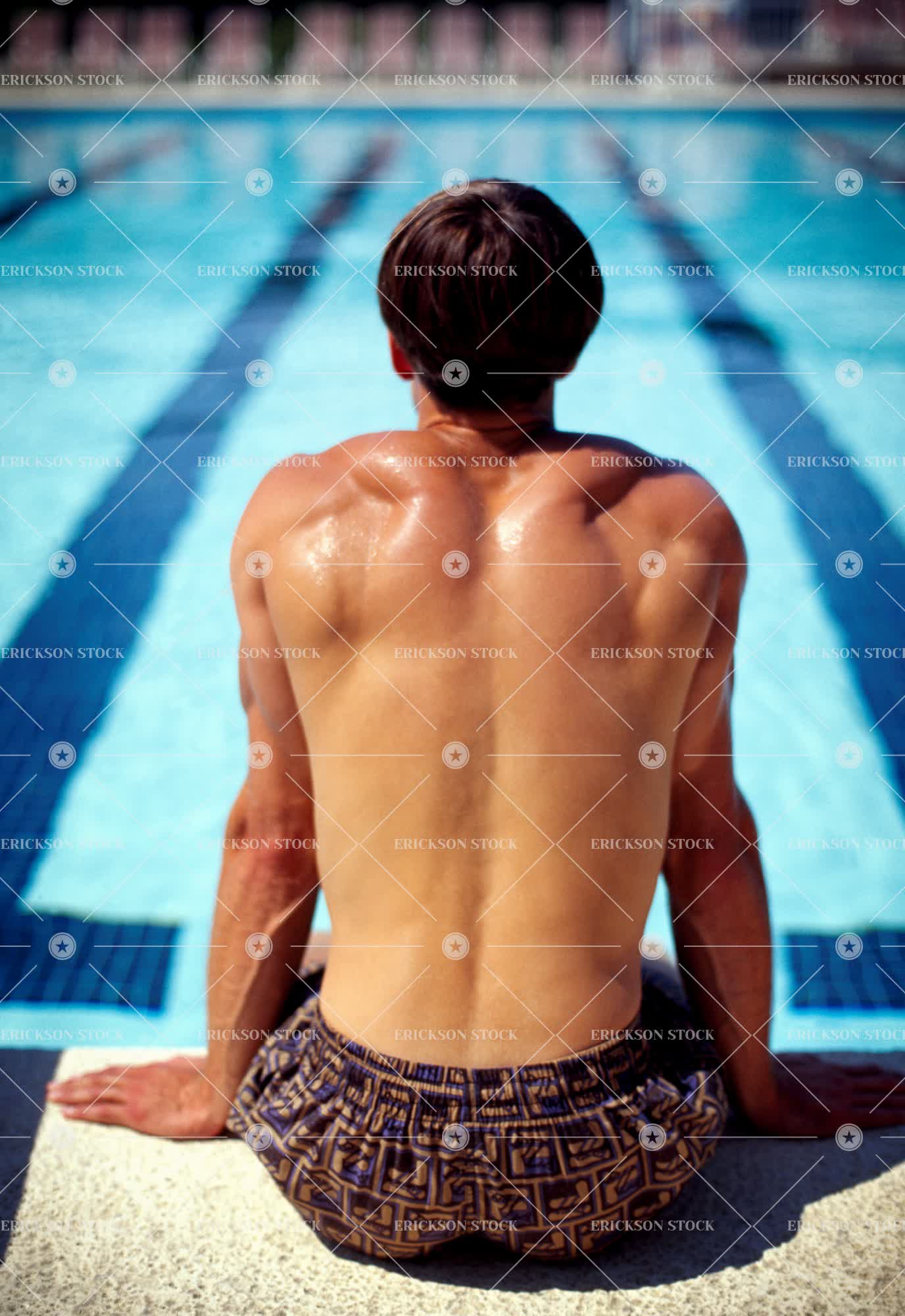 Tags adult, at the edge, back, back view, bare chested, bathing suit, brunette, caucasian, contemplate, day, edge, leisure, leisure activities, leisure activity, male, man, mid adult, one person, outdoor, outdoors, outside, pensive, people, person, pool, pools, rear, rear view, recreation, recreational pursuit, recreational pursuits, selective focus, semi dress, shirtless, sit, sitting, Summer, summery, swim, swimmer, swimmers, swimming, swimming pool, swimming trunks, swims, swimsuit, swimwear, thinking, thoughtful, three quarter length, vertical, warm, warmth, water, young adult