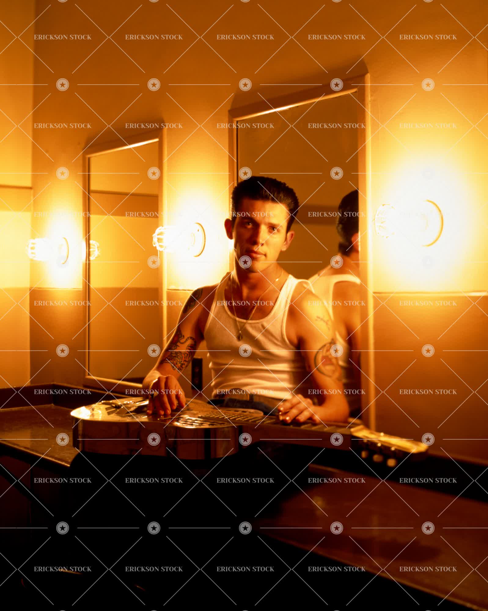 Portrait of a young man sitting in a dressing room with a guitar on his lap.