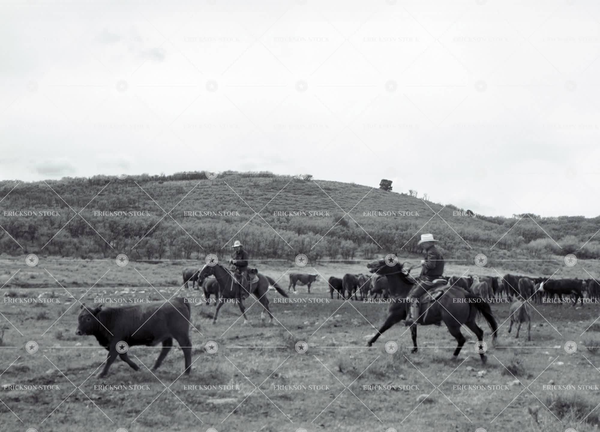 Two men herding cattle while on horseback in the country.