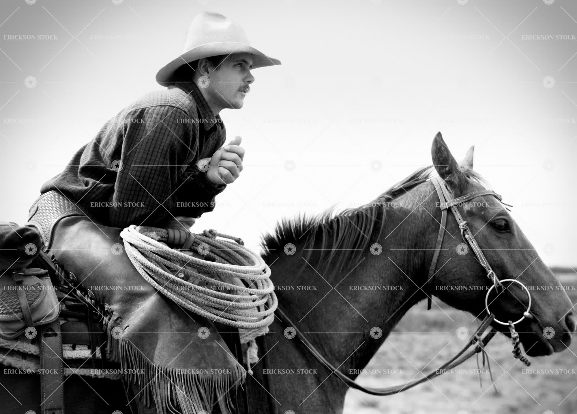 Tags adult, agriculture, animal, at work, black and white, bridle, caucasian, concentrate, country, countryside, cowboy, cowboy hat, day, domestic, equine, equines, farm, farming, farms, field, fields, frame, framed, Grassland, grasslands, hat, hats, herbivore, herbivores, herbivorous, hoof, hoofed, hoofed animal, hoofed animals, horizontal, horse, horse riding, horseback riding, horses, male, Mammal, mammals, man, Meadow, meadows, mid adult, monochrome, one animal, one person, outdoor, outdoors, outside, paddock, paddocks, pasture, pastures, people, person, profile, protective clothes, Protective clothing, protective gear, ranch, rancher, remote, remoteness, ride, riding, rope, ropes, rural, saddle, saddles, Side view, sit, sitting, three quarter length, transport, Transportation, vignette, work, working, working animal, working animals, young adult