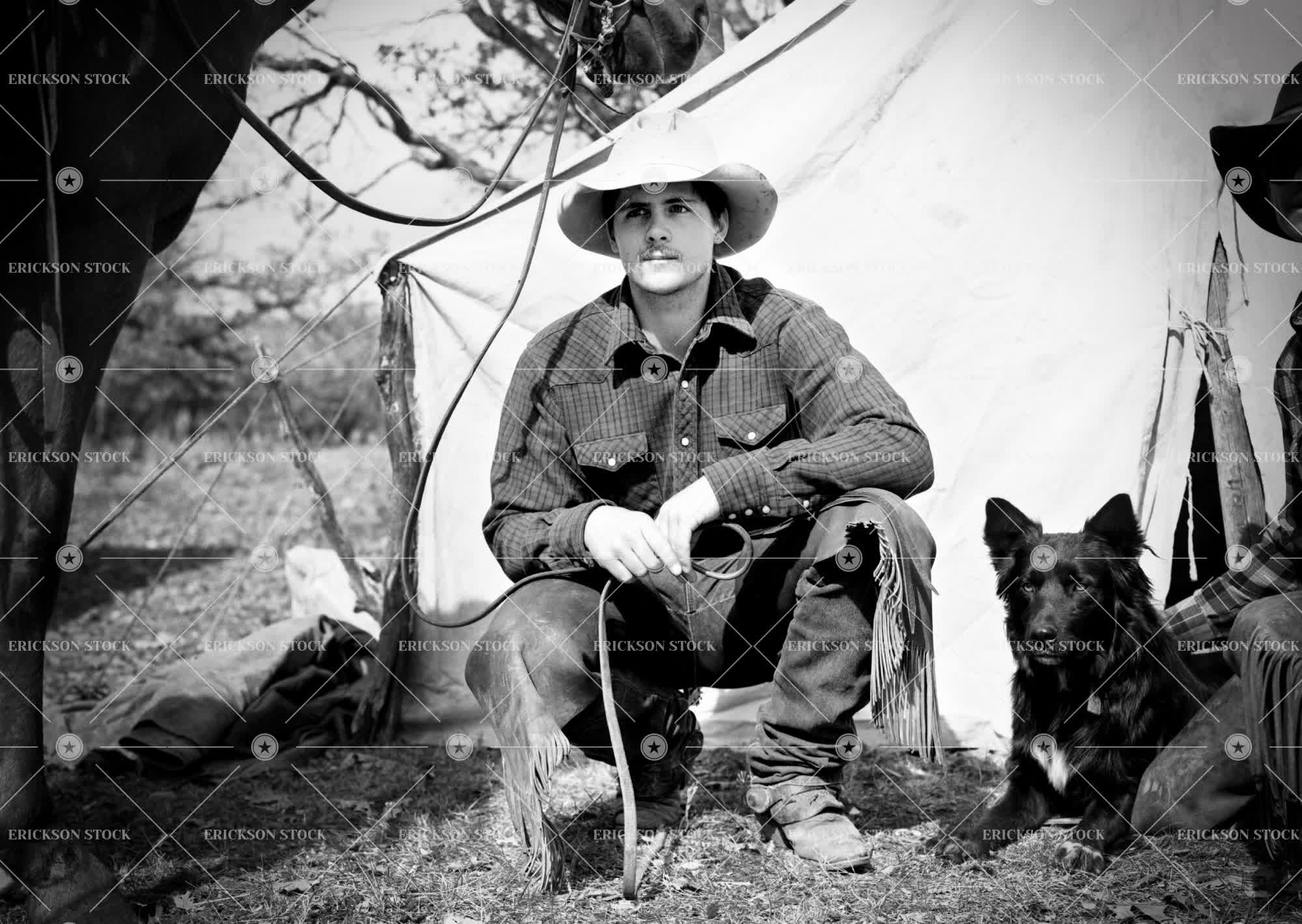 Tags adult, american, animal, black and white, camp, canvas, caucasian, cowboy, cowboy hat, crouch, day, dog, domestic, facial hair, field, fields, full length, hat, hats, horizontal, male, man, monochrome, moustache, moustaches, mustache, mustaches, one animal, one person, outdoor, outdoors, outside, person, pet, pets, selective focus, sit, sitting, squat, Squatting, tent, tents, wild west, young adult