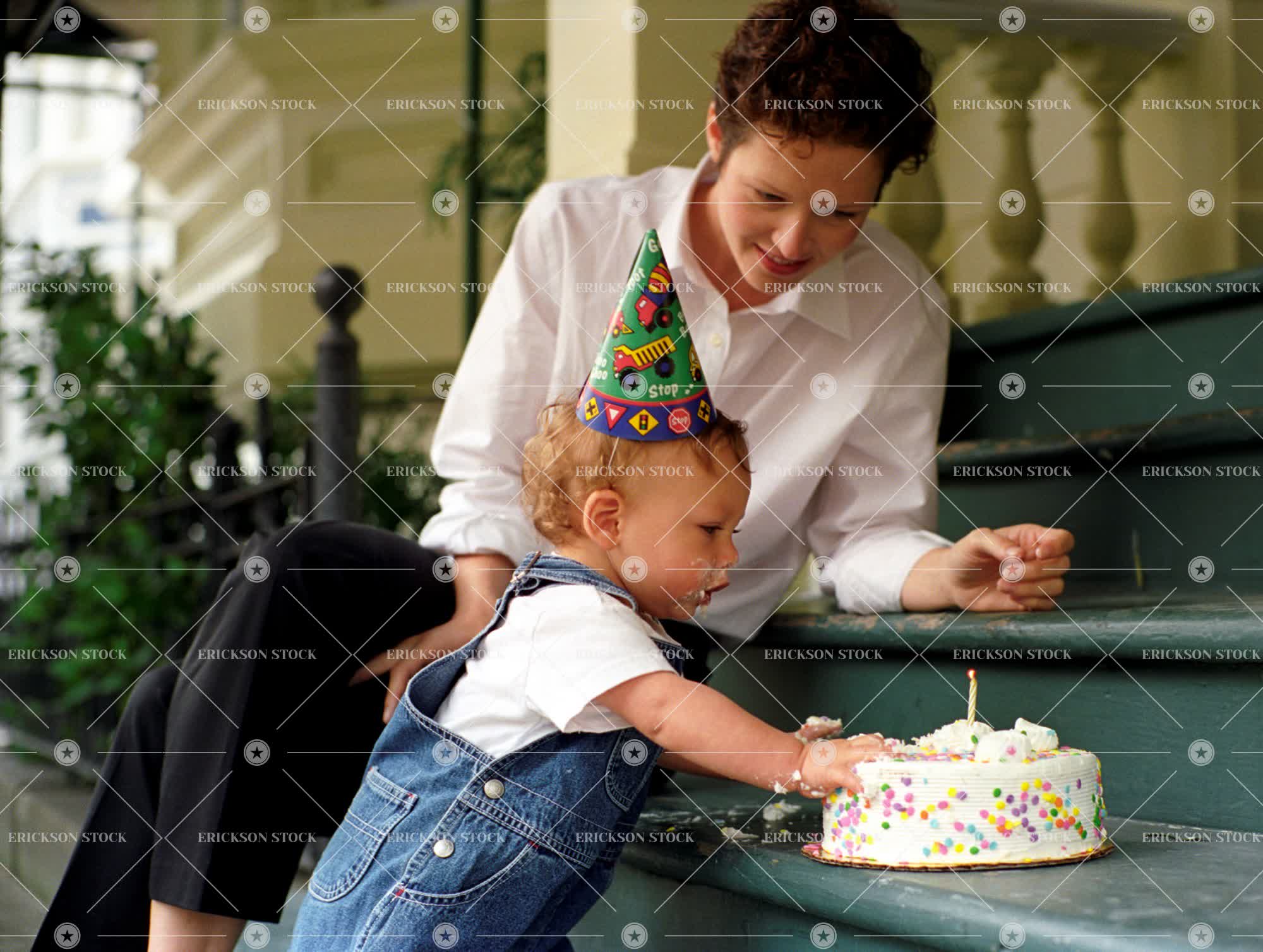 Smiling mother watching her young son push his hands into a birthday cake on the porch steps of their house.